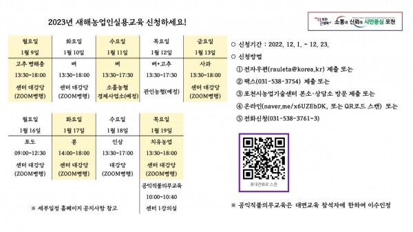 2023년 1월 9일 고추 과정을 시작으로 19일까지 추진되는 실용교육은 대면교육과 줌 플랫폼을 활용한 비대면 교육을 함께 진행할 예정이다.