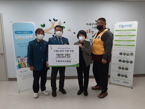 가평로타리클럽의 드림스타트 아동의류지원사업은 지난해에 이어 올해에도 추진됐으며 기초수급자·한부모·조손가정 등 경제적으로 어려운 가정의 초등학생 10명을 선정해 오리털 점퍼 등 구입을 지원할 예정이다.