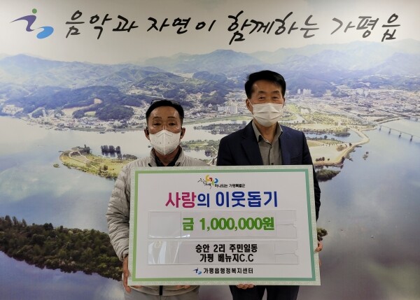 이에 임상호 가평읍장은 “가평읍을 따뜻한 온기로 채울 수 있도록 도와주신 승안 2리 주민일동, 가평 베뉴지 C.C, 잣 공작소에 감사의 인사를 드리며 기탁자 분들의 정성을 가득 담아 가평읍 어려운 이웃들에게 잘 전달하겠다”고 말했다.