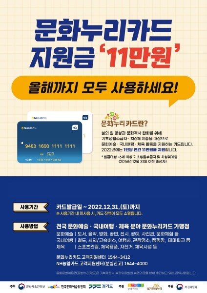 시 관계자는 “2022년 문화누리카드 지원금액이 총 11만원으로 증가한 만큼, 지원금이 소멸되지 않도록 꼭 사용해 주시길 바란다”고 밝혔다.