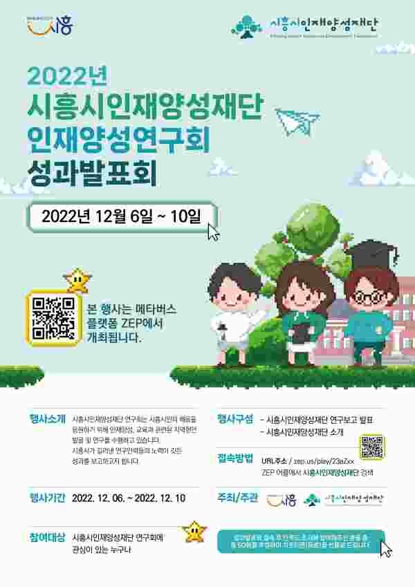 지난 2021년 12월에 발족한 시흥시인재양성재단 인재양성연구회는 시흥시 교육발전을 위해 시흥시에서 나고 자란 연구원들이 모여 인재양성사업, 교육지원사업 등 지역현안 발굴과 연구 수행에 힘써왔다.