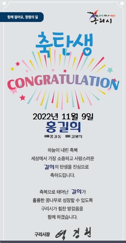 백경현 구리시장은 “새로운 생명 탄생을 축하하고 빠르게 변화하는 시대흐름과 괴리되어 있는 정책들을 시대에 맞게 개편해 시민들에게 필요한 서비스를 제공할 수 있도록 최선을 다하겠다”고 전했다.