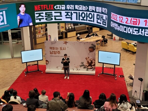 시는 독서 진흥과 지식 정보 확산, 도서관 문화 사업의 일환으로 ‘책 읽는 도시 남양주 작가 초청 강연회’를 마련했으며 첫 번째 강연으로 넷플릭스 화제의 드라마였던 ‘지금 우리 학교는’의 원작 웹툰을 그린 주동근 작가를 초청해 데뷔 과정 및 스토리텔링, 작품의 영상화 과정 등 생생한 작업 이야기를 들었다.