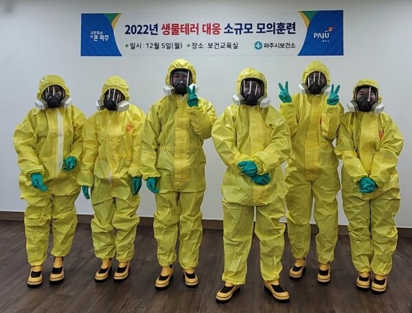 이번 훈련은 파주경찰서 파주소방서와 협조해 이전의 정형화된 시나리오 훈련에서 벗어나 개인보호복 착·탈의 다중탐지키트 사용 검체수송용기 이용 및 이송 등 생물테러 초동대응요원의 역량 강화에 초점을 둔 실습 훈련으로 진행됐다.