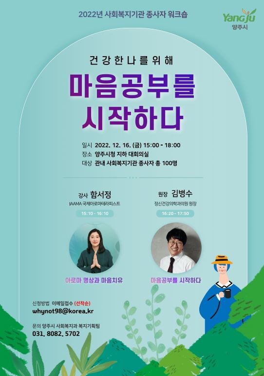 3년 만에 대면 방식으로 진행되는 이번 워크숍은 기관 종사자들의 마음 회복을 위해 함서정 소소명상실 대표와 함께하는 아로마 키트를 활용한 명상 체험과 ‘마흔, 마음공부를 시작했다’의 저자인 김병수 정신건강의학과 전문의의 특강으로 구성된다.