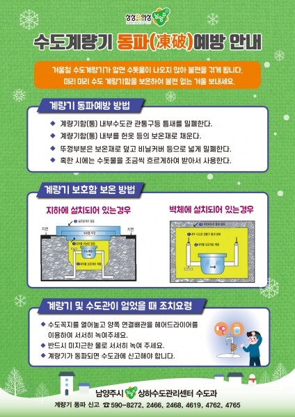 상하수도관리센터 관계자는 “한파 특보 시에는 수도 계량기 보온 상태를 다시 한번 점검해 수도 계량기 보호통 내부를 헌 옷, 인조 솜 등 습기가 없는 보온재로 채우고 야간 또는 외출 시 수도꼭지를 조금씩 틀어 놓는 등 수도 계량기 동파 예방을 위한 주민 여러분의 관심과 협조를 부탁드린다”며 “계량기 동파 시에는 신속히 신고해 주시기 바란다”고 당부했다.