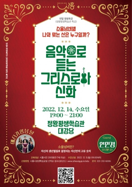 특강은 정왕평생학습관 대강당에서 14일 저녁 7시부터 9시까지 대면으로 운영되며 세종문화회관 협력예술단체인 에티카 앙상블과 타로마스터 한민경 작가가 함께 진행한다.