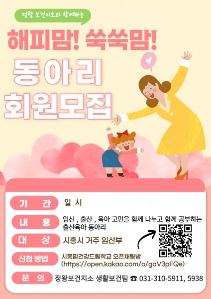 참여 대상은 시흥시 거주 임산부나 육아맘은 누구나 참여 가능하며 신청은 ’시흥맘 건강드림학교 오픈채팅방’이나 정왕보건지소 모자보건실로도 신청할 수 있다.