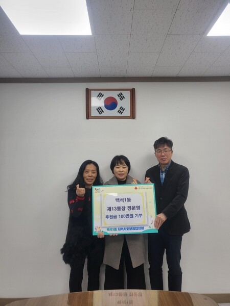 한철희 백석1동장은 “선뜻 기부를 해주신 정운영 통장님에게 감사드린다”며 “경제가 어려운 요즘 이러한 기부는 얼어붙은 지역사회를 온기로 덮여주는 따뜻한 난로와 같다 전달받은 기부금은 주민들을 위해 뜻깊게 사용하겠다”고 밝혔다.