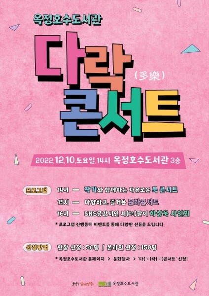 시 도서관 관계자는 “2022년 연말을 장식할 ‘다락콘서트’는 도서관에서 다채로운 문화를 향유할 수 있도록 마련한 북콘서트로 책과 마술, 음악이 함께하는 힐링의 시간을 느끼시길 바란다”고 전했다.