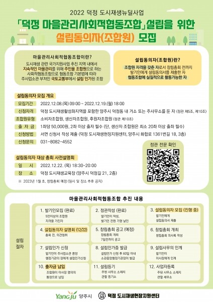 또한 설립동의자는 오는 22일 덕정 마을관리사회적협동조합 설립동의자 설명회와 1월 5일에 개최 예정인 덕정 마을관리사회적협동조합 창립총회에 모두 참석해야 한다.