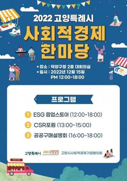 이번 행사에서는 ESG팝업스토어, 고양시 사회적경제기업과 CSR포럼의네트워크 미팅, 사회적경제 공공구매 설명회가 진행된다.