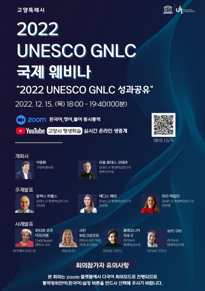 고양시와 유네스코 평생학습연구소가 공동 주최하는 이번 웨비나는 UNESCO GNLC 회원도시 76개국 294개 도시가 참여하는 2022년 글로벌 학습도시 활동성과를 공유하고자 마련됐다.