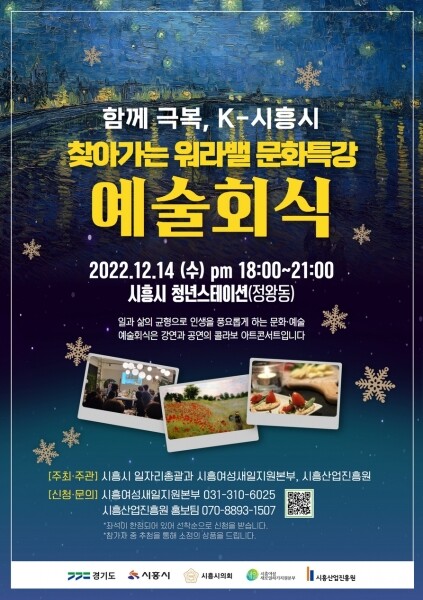 시흥산업진흥원과 협업해 진행하는 이번 행사는 함께 만들어가는 대한민국 대표도시 ‘K-시흥시’ 시정에 발맞춰, 워라밸 문화특강 ‘인생음미 예술회식’을 개최해 산업단지에 활력을 불어넣고 코로나19 및 산업 환경악화로 어려움을 겪는 기업인 및 근로자들이 함께 공감하고 즐길 수 있는 문화예술 공연을 선보이고자 마련됐다.