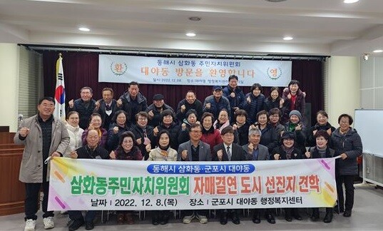 동해시 삼화동 주민자치위원회에서 군포 대야동을 방문한 것.심용호 위원장을 비롯한 삼화동 주민자치위원들은 자매결연 단체인 대야동 주민자치위원회를 방문해 기념품을 전달하고 화합의 시간을 가졌다.