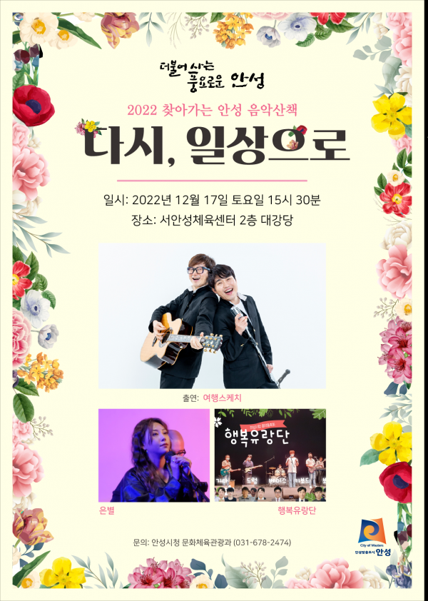 무료공연으로 당일 공연 1시간 전인 오후 2시 30분부터 선착순 입장 예정이며 서안성체육센터 내 무료주차가 가능하다.