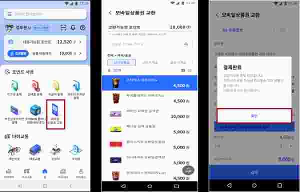 서비스를 이용하려면 ‘스마트 시티패스’ 앱에서 ‘포인트사용 → 모바일 상품권 교환’을 클릭하고 필요에 따라 커피, 주유, 편의점 등 모바일 상품권으로 교환하면 된다.