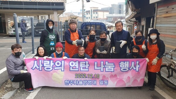 안병호 대장은 “겨울철 제대로 된 난방조차 어려운 지역에 취약계층 세대가 많이 있다”며 “코로나 장기화와 경제적 여건이 어려워져 봉사활동이 점점 사라지고 있어 안타깝지만, 우리 한주자율방범대원들의 작지만 따뜻한 마음을 모은 연탄이 어려운 이웃들의 훈훈한 겨울나기에 도움이 되기를 바랄 뿐이다”고 전했다.