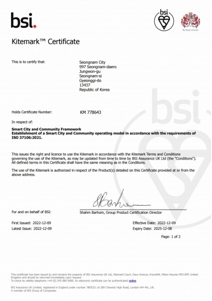 성남시 관계자는 “인공지능, 사물인터넷, 드론 등과 같은 첨단 기술로 도시 문제를 해결하고 시민에 다양한 도시서비스를 제공하고 있다”며 “이번 스마트도시 국제인증 획득으로 4차 산업혁명 특별도시 추진에 힘을 받게 됐다”고 말했다.