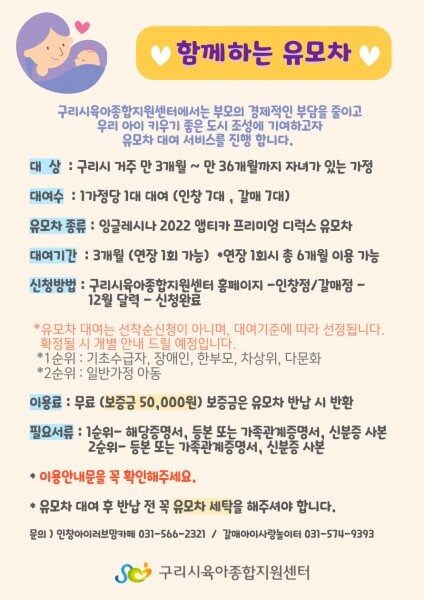 유모차 대여사업은 디럭스 유모차 14대를 마련해 관내 만3개월에서 만36개월 자녀가 있는 가정을 대상으로 기본 3개월에서 최대 6개월 동안 유모차를 무료로 대여해주는 사업이다.