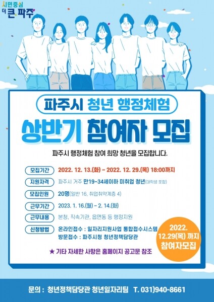 신청 자격은 공고일 현재 주민등록상 파주시에 거주하는 만 19~34세 이하 미취업 청년으로 2023년 1월 6일 추첨방식을 통해 우선선발 4명, 일반선발 16명이 선정된다.
