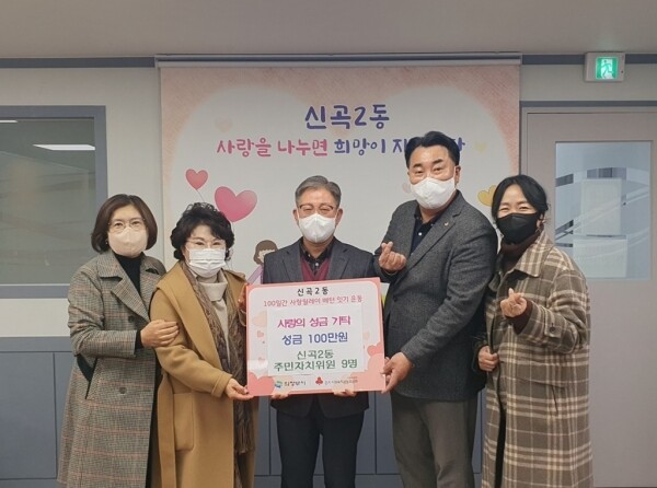 100일간 사랑릴레이 배턴 잇기는 아름다운 기부문화 정착을 위한 범시민 이웃사랑 나눔 운동으로 신곡2동 주민자치회는 12월 5일 성금 2,405,960원을 기탁한 데 이어 송명호 회장 외 위원 8명이 추가적으로 기부행렬을 이어가며 지역사회 내 나눔문화 확산에 적극 기여하고 있다.