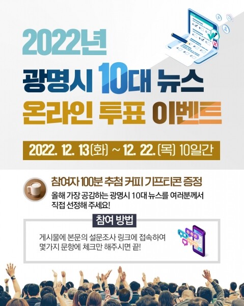 이번 온라인 투표는 올 한해 광명시의 주요 뉴스에 대한 시민의 의견을 수렴해, 향후 시정 운영과 홍보 자료에 활용하고자 실시한다.