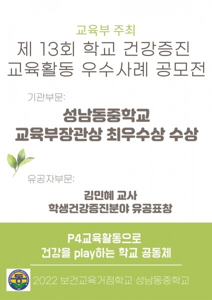 이는 구 성남의 여러 가지 교육적 혜택의 어려움 가운데에서도 예방적 교육활동 , 참여형 교육활동 , 맞춤형 교육활동 , 즐거운 교육활동 의 ‘P4 교육활동으로 건강을 play하는 학교 교육공동체’라는 건강증진사업을 운영으로 효과적인 학교 건강증진 교육활동 구축과 확산의 공을 인정받아 교육부 장관상을 받게 됐다.