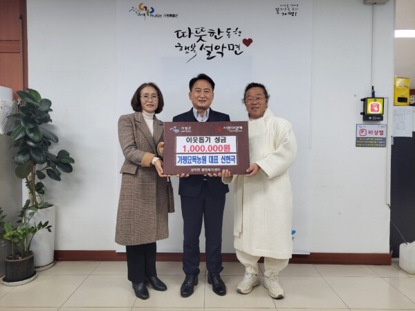 이에 이범주 설악면장은 “관내 어려운 이웃을 위해 선뜻 큰 금액의 성금을 쾌척해 주신 가평묘목농원에 감사 인사를 전한다”고 하며 “관내 복지사각지대 취약계층이 발생하지 않는 따뜻한 동행 행복설악면을 만들어 나가도록 하겠다”고 화답했다.