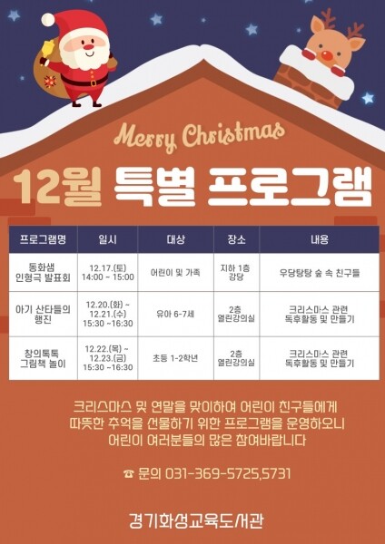 이번 행사는 크리스마스와 연말을 맞이해 ‘동화샘’ 인형극 발표회와 도서관 어린이실 크리스마스 프로그램으로 구성했다.