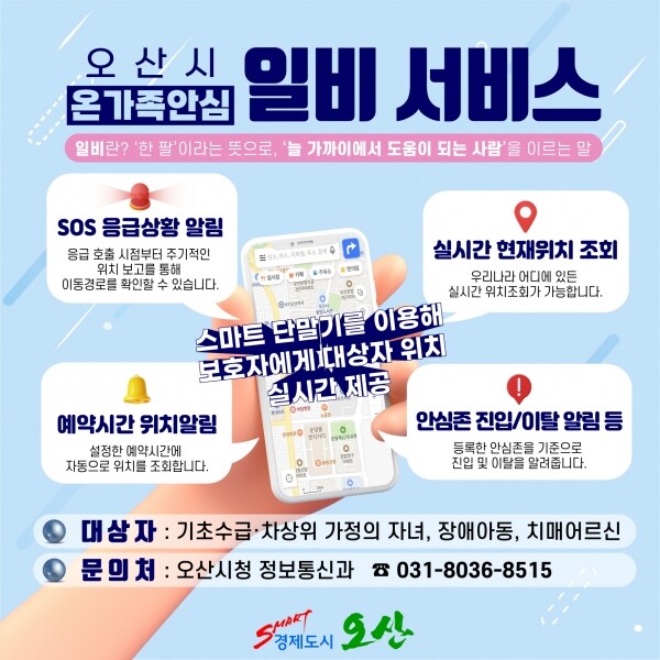 시청 정보통신과에서 운영 중인 “오산시 온가족 안심 일비 서비스”는 사물인터넷 통신 기술을 이용해 보호자에게 대상자의 위치 정보를 실시간으로 제공하는 서비스다.