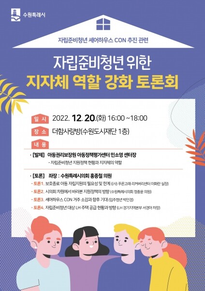 이날 토론회에서는 ‘셰어하우스 CON’을 운영하는 수원시가 자립준비청년을 위해 어떻게 역할을 강화할지 논의할 예정이다.