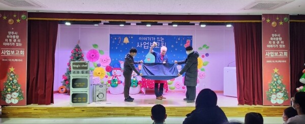 1부에서는 올 한해 양주시육아종합지원센터에서 추진한 가정양육 지원사업, 어린이집 지원사업 및 지역사회연계사업 등의 성과 보고와 공모전 시상을 진행했으며 2부 행사로 영유아와 함께하는 맛있는 마술쇼 공연으로 연말 즐거움을 선사했다.