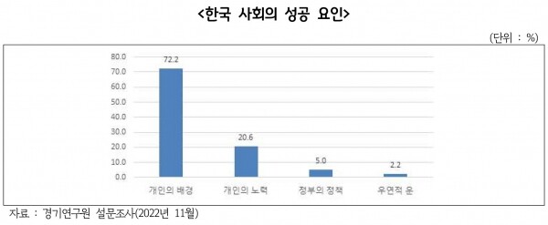 반면 개인의 노력은 20.6%에 불과했고 정부의 노력은 5.0%, 우연한 운은 2.2%로 나타났다.