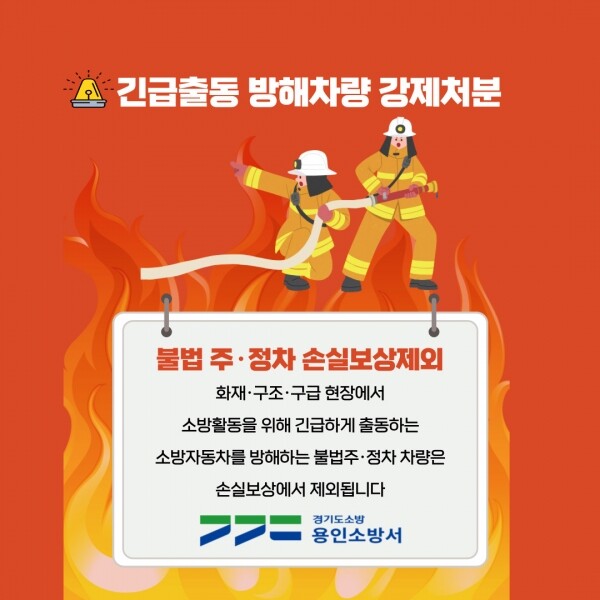 서승현 서장은 “소방자동차의 통행을 방해하는 차량에 대한 강제처분이 가능하며 불법 주·정차된 차량은 손실보상에서 제외된다”며“시민의 생명과 재산을 지킬 수 있도록 소방통로 확보에 관심을 기울여 주시길 바란다”고 전했다.