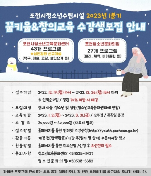 2023년 1분기 꿈키움·창의교육 프로그램은 2023년 1월 2일부터 3월 31일까지 총 12주차로 진행된다.