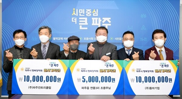 파주시행복장학회는 19일 ㈜동마기업과 ㈜파주컨트리클럽에서 각 천만원, 조용무 어르신으로부터 5백만원을 기탁받았다.