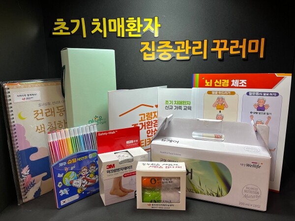 초기 치매 환자 집중관리 서비스 꾸러미는 운동법 리플릿, 고령자 주거환경 안심 스티커북, 초기 치매 환자 신규 가족 교육 책자, 실내용 미끄럼 방지 테이프, 영양 관리를 위한 뉴케어, 스트레스볼, 약달력, 인지 향상을 위한 컬러링북 등으로 구성되어 있다.