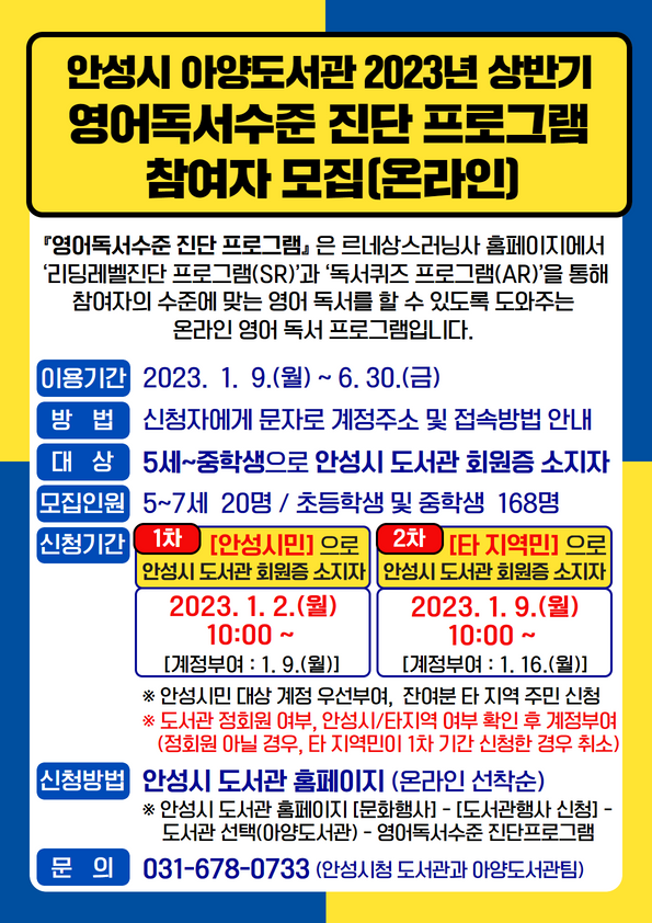 안성시는 지난 2020년 아양도서관을 개관하며 도서관 자료실 내에서 태블릿을 빌려 프로그램을 이용하는 것으로 시작했는데 2021년부터는 더 많은 어린이가 언제, 어디서든 온라인으로 편하게 프로그램을 이용할 수 있도록 반기별로 참여자를 모집해 계정을 제공하고 있으며 프로그램을 통해 어린이가 각 가정에서 영어독서를 하는 데에 도움이 되고 있어 학부모들의 많은 관심을 받고 있다.