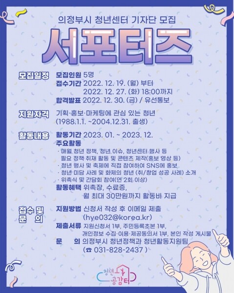 시는 접수한 개인 SNS 활동 실적 및 언론경력 등을 심사한 후 최종 5명을 선발해 제2기 의정부시 청년센터 서포터즈 기자단으로 위촉한 후 2023년 1월부터 12월까지 1년간 운영할 예정이다.