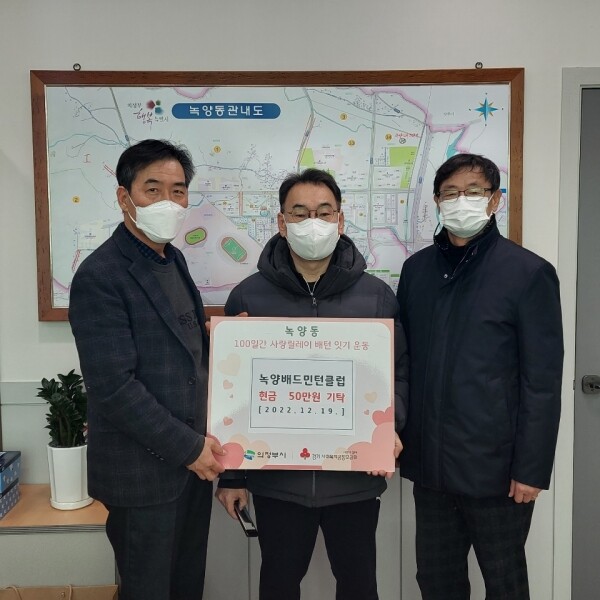 권영찬 녹양배드민턴클럽 회장은 “어려운 이웃들에게 도움을 주고자 하는 200명 회원님들의 따뜻한 마음을 모아 100일간 사랑릴레이 배턴잇기에 참여하게 됐다”며 “이웃들이 추운 날씨에 조금이나마 따뜻함을 느낄 수 있기를 바라며 앞으로도 어려운 이웃들에게 도움의 손길을 건넬 수 있도록 노력하겠다”고 나눔의 마음을 전했다.