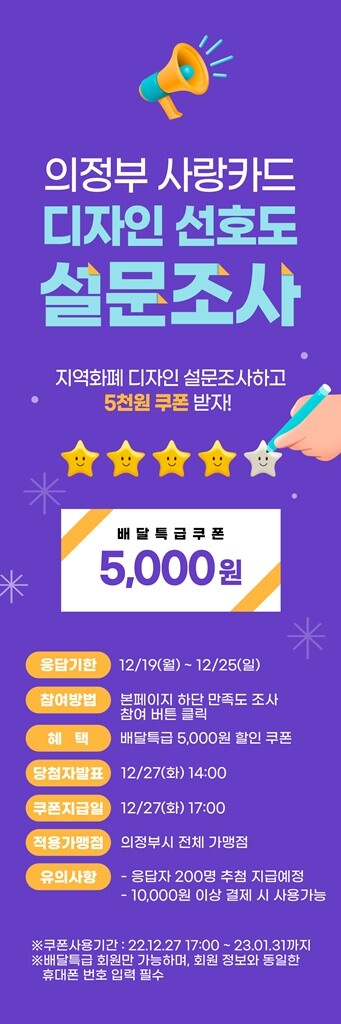 시는 새로운 카드 출시를 위해 12월 19일부터 26일까지 8일간 경기도 공공배달앱‘배달특급’에서 디자인 선호도 설문조사를 진행하고 있으며 참여자 200명에게 배달특급 쿠폰 5,000원을 제공한다고 밝혔다.
