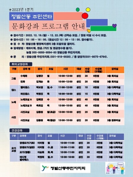 1분기 문화강좌는 2023년 1월 2일부터 3개월간 진행되며 12월 19일부터 12월 22일까지 정발산동 행정복지센터에서 선착순으로 신청 가능하다.
