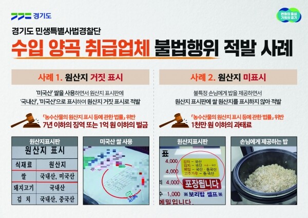 경기도 민생특별사법경찰단은 지난 11월 21일부터 12월 9일까지 도내 수입 양곡 취급업체 353곳을 단속한 결과 50개소를 적발했다고 21일 밝혔다.