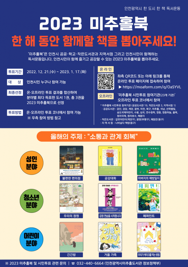 신순호 인천시 미추홀도서관장은 “2023 미추홀북으로 선정된 도서는 인천시 책 읽는 분위기 확산, 지역사회 공감과 화합의 장 형성에 기여할 것”이라며 “인천시민과 함께하는 행사인 만큼 시민들의 적극적인 투표 참여”를 당부했다.