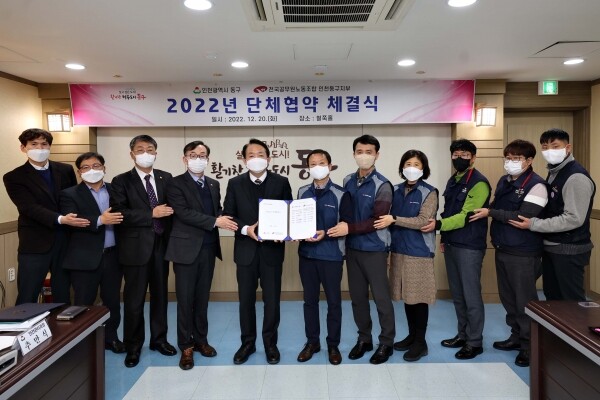 김찬진 동구청장은 “이번 공무원 단체협약으로 직원들이 더 나은 근로환경에서 일할 수 있는 발판이 마련되길 바란다”며 “구와 노조가 구정 발전을 위한 동반자로 살고 싶은 도시, 활기찬 행복도시 동구를 만들기 위해 더욱 노력하겠다”고 말했다.