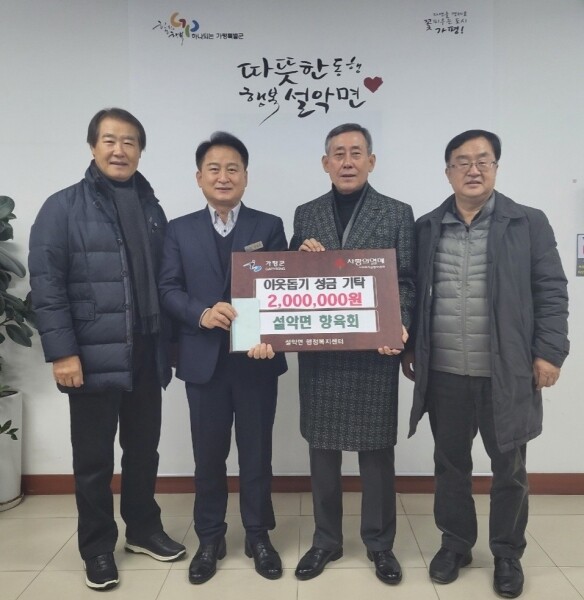 설악면 향육회 이의명 회장은 “어려운 이웃들을 위해 어떤 방법으로 도움을 주는 것이 최선일까 고심 끝에 성금으로 기탁하게 됐다.