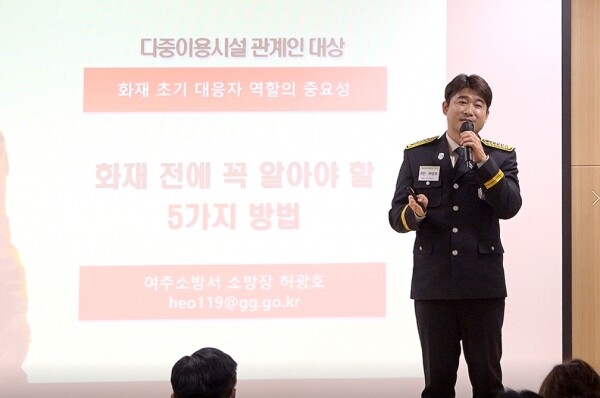 허광호 소방장은 ‘화재 전에 꼭 알아야 할 5가지 방법’이라는 주제로 강의해 화재 예방과 화재 초기 대응자 역할의 중요성 등을 각종 사례 분석을 통해 알기 쉽게 설명했다.