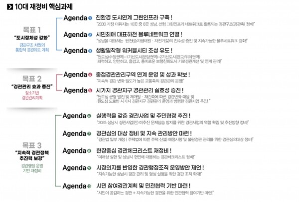 이를 위해 10대 재정비 핵심과제인 친환경 도시 연계 그린인프라 구축 원도심 도로변 경관관리 사업 경관 심의 대상 정비와 지속 관리 방안 시민 참여 경관계획과 민관협력 기반 마련 등의 과업을 수행한다.